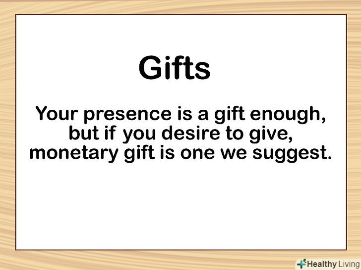 Натякніть гостям, що б ви хотіли бачити в якості подарунка. багато батьків не хочуть більше іграшок для дітей. Якщо ви хочете щось особливе, прямо вкажіть це в запрошенні. Позначте, чи хочете ви практичні речі, гроші, листівки або вам взагалі нічого не потрібно. Це не буде неввічливо, просто допоможе гостям не ламати голову над покупкою того, що Вам навіть не потрібно.- Однак не варто вимагати занадто дорогих подарунків. Якщо гості бережуть свої гроші, вони, швидше за все, не прийдуть, якщо ви зробите подарунки обов'язковими.