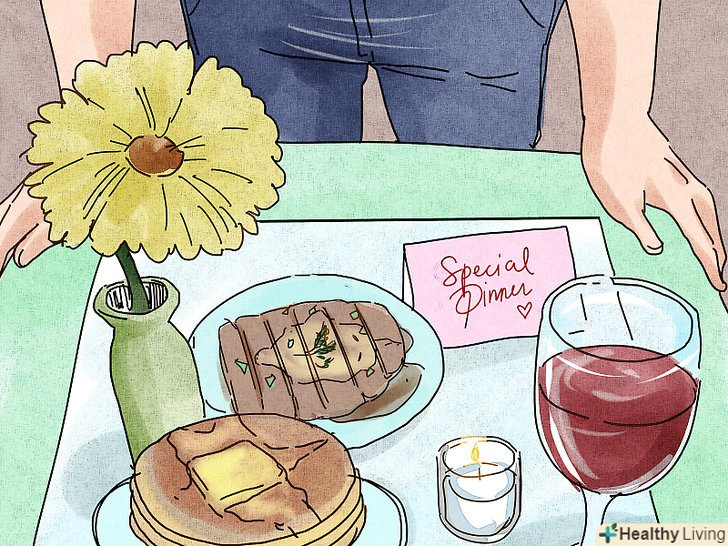 Продумайте план на день. Мало що говорить про те, що людина вам доріг, так, як бажання провести з ним час. Якщо ви добре знаєте людину, щоб придумати заняття на весь день, тим краще. Подумайте, що Вам подобається робити у Вашому місті або за його межами (улюблені кафе, заняття, місця), і сплануйте день так, щоб в ньому були всі ці заняття. Влаштуйте сюрприз! [13]- Домовтеся про те, що ви зустрінетеся вранці. Коли прибудете на місце, покажіть людині план на день — прикріпіть його до меню ресторану, де ви разом з'їсте улюблене блюдо на сніданок.