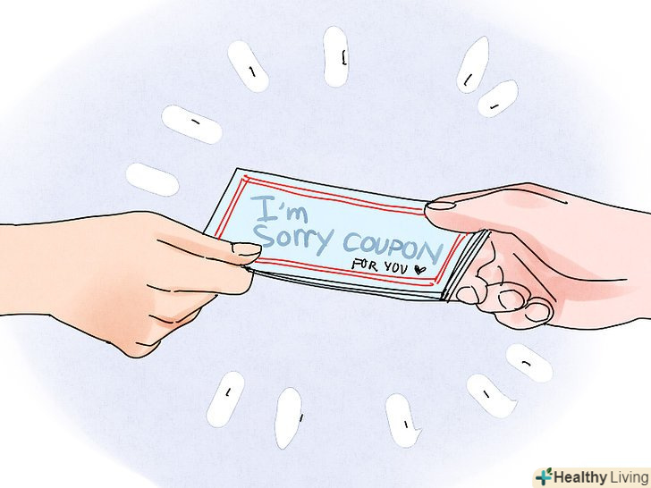 Зробіть купони. щоб вибачення не було разовою дією, можна зробити купони на ваші послуги, якими людина може скористатися, коли захоче. Подумайте про характер людини і про те, що йому буде корисно. Можна зробити купони самостійно з паперу, надрукувати на комп'ютері або скористатися особливими сервісами в Інтернеті, які дозволяють роздрукувати готові купони. На звороті кожного купона напишіть, який послузі він відповідає. [3]