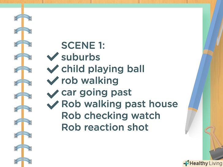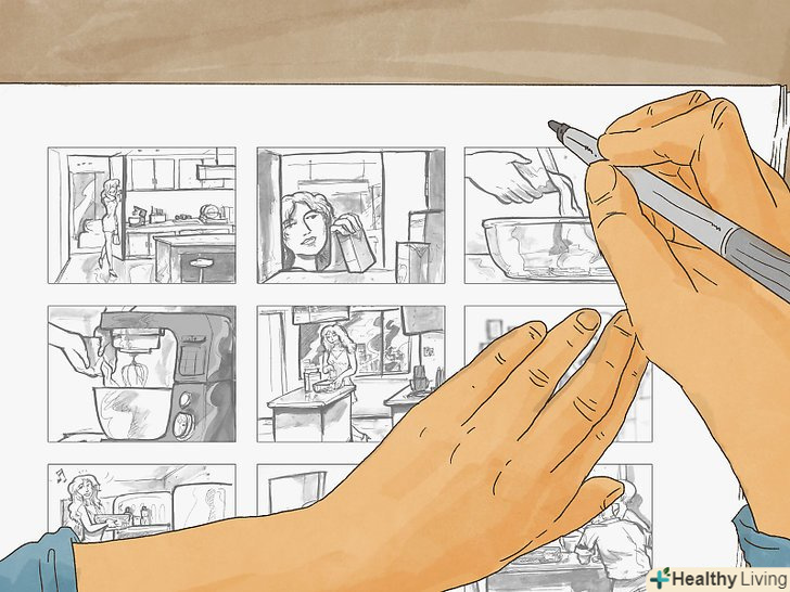Зробіть розкадрування.розкадровка-це послідовність малюнків з планом кожної сцени. Такі малюнки повинні бути не докладними або високохудожніми, а чіткими і зрозумілими, щоб режисер міг отримати уявлення про всі сцени. Зробіть розкадрування до початку зйомок, щоб пам'ятати події кожної сцени і не витрачати час на спроби згадати повороти сюжету.[4]- Якщо ви погано малюєте, то використовуйте схематичні зображення персонажів і елементів сцени.