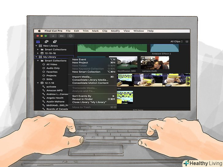 Завантажте знятий матеріал в редактор фільмів.завантажте всі відеофайли в програму для монтажу. Розсортуйте сцени по окремих папках, щоб мати швидкий доступ до файлів. Організація полегшує роботу. Після трансферу і сортування файлів приступайте до монтажу і редагування.[13]- В якості програми для монтажу можна використовувати Avid, Final Cut Pro або Windows Movie Maker.
