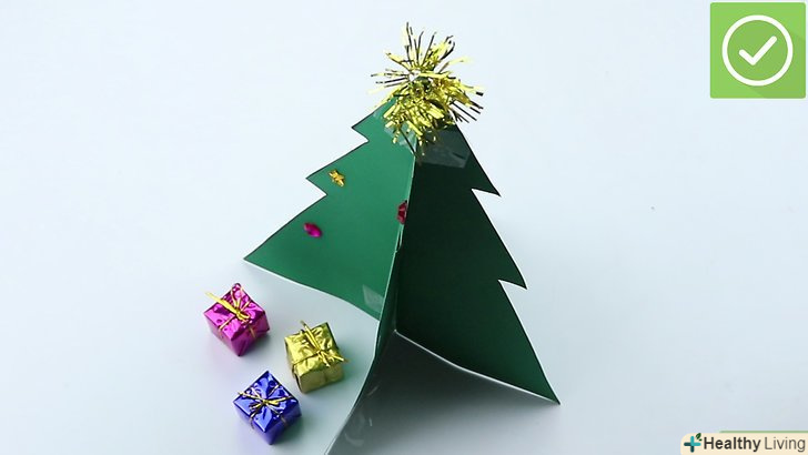 - З'єднайте дві деталі, щоб вийшла об'ємна ялинка. вставте деталі одна в іншу через прорізи так, щоб їх середини зустрілися. Розправте вийшло дерево так, щоб воно могло стояти на будь-якій поверхні самостійно.