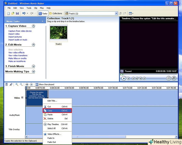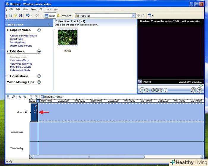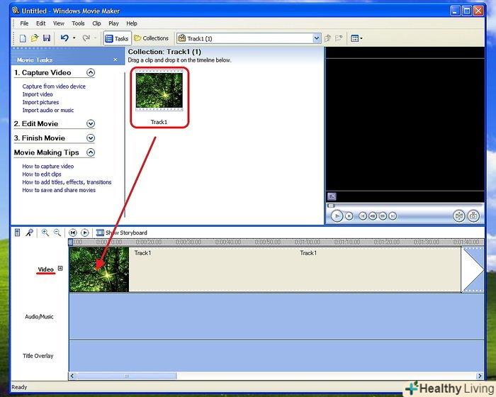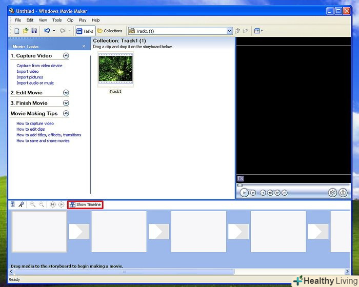 Перетягніть своє відео на шкалу часу.на шкалі часу є три доріжки. Верхня-це відео, Середня-Звук або музика, а нижня-накладення назви. Відео потрібно перетягнути зі збірки на доріжку під назвою відео. Тепер воно буде відображатися на шкалі часу.