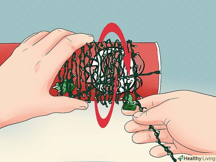 Замотайте вільний кінець гірлянди навколо пучка посередині і застроміть вилку в роз'єм. у вас вийшов акуратно складений пучок з лампочок. Обмотайте вільні кінці гірлянди навколо пучка посередині і з'єднайте кінці, встромивши вилку в роз'єм. [13]