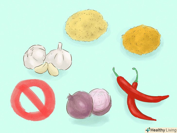 Внесіть корективи в свій раціон харчування. виключіть продукти, що викликають неприємний запах тіла. [1] якщо ви схильні до пітливості, дізнайтеся які продукти необхідно виключити зі свого раціону.- Цибуля, часник та інші подібні продукти можуть викликати неприємний запах під пахвами. Деякі спеції, такі як асафетида, кмин і каррі можуть посилювати потовиділення. Крім того, виключіть зі свого раціону хрестоцвіті овочі, такі як капуста або брокколі.