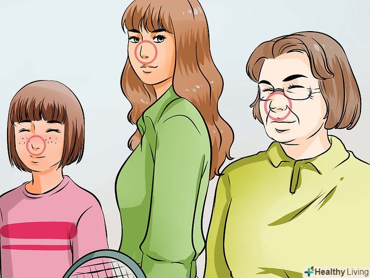 Визнайте, що з часом форма носа змінюється. у людини форма носа змінюється протягом усього життя. З віком перегородка носа стає слабкіше, і ніс починає опадати. Він може стати трохи ширше або довше в міру того, як людина стає старше. [4]- Незалежно від того, що ви думаєте про свій ніс зараз, він продовжує змінюватися, так само як і змінюється ваше тіло.