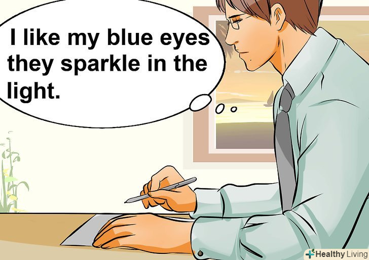 Підвищуйте свою самооцінку зовнішності. знову ж таки, напишіть список своїх улюблених фізичних якостей. Якщо ж у вас виникли труднощі з наведенням прикладу, то подумайте про тих сторонах, які турбують вас найменше. [6]- На кожне з цих якостей напишіть по одній позитивній фразі. Наприклад, ви можете сказати, «мені подобаються мої блакитні очі, тому що вони виблискують при світлі».