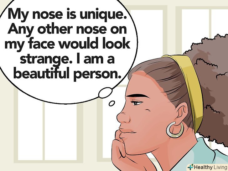 Спробуйте вправи пізнавального переконання. ця вправа допоможе нам пам'ятати про те, що найважливіше це те, що ми думаємо про людину пізнавально. Коли ми запитуємо про те, що найбільше нам подобається в нас самих же, ми часто ставимо індивідуальні якості над фізичними особливостями. Це нагадує нам про те, що індивідуальність і здібності набагато важливіше фізичних якостей [5] також це нагадує нам, що ми володіємо здатністю визначати власну самооцінку на своїх умовах, а не на тих, що накладає на нас наша культура.- Складіть список трьох ваших найулюбленіших фізичних якостей. Ви можете натренувати себе думати про своє тіло в цілому більш позитивно. Це може допомогти Вам прийняти свій ніс і побачити і його красу теж. Список з трьох улюблених фізичних якостей. Наприклад, ви можете сказати: «мені подобаються мої очі, у мене довгі вії і красиві пальці».