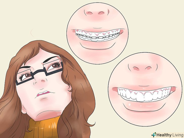 Виберіть окуляри і брекети, які відповідають вашій індивідуальності. є різні варіанти кольорів і форм очок. Є також варіанти контактних лінз. Деякі пацієнти можуть носити Invisaling замість брекетів, навіть круглі гумки в скобах можуть підійти тим, хто хоче різнокольорові, або білі/прозорі для тих, хто віддає перевагу витончені.- Не думайте, що наявність окулярів або скоб робить вас не привабливими на деякий час. Ви повинні будете носити їх якийсь час, тому можете використовувати їх по максимуму.