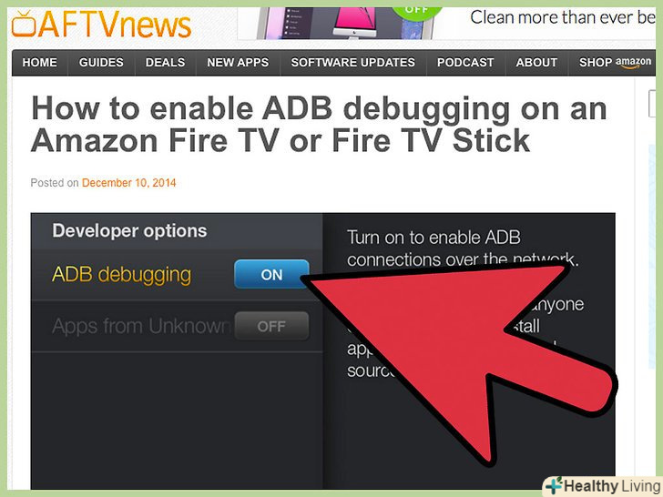 На Amazon Fire TV увімкніть ADB Debugging (налагодження).перше, що потрібно зробити, це включити ADB Debugging на Amazon Fire TV. Це дозволить підключитися до ТВ приставці, внести зміни і завантажити XBMC. Для цього перейдіть в Settings- gt; Developer Options (Налаштування- gt; Опції розробника) і включіть ADB Debugging (налагодження). Потім відкрийте Settings- gt; About – Network (Налаштування- gt; про пристрій – мережу) і запишіть IP-адресу свого Fire TV.