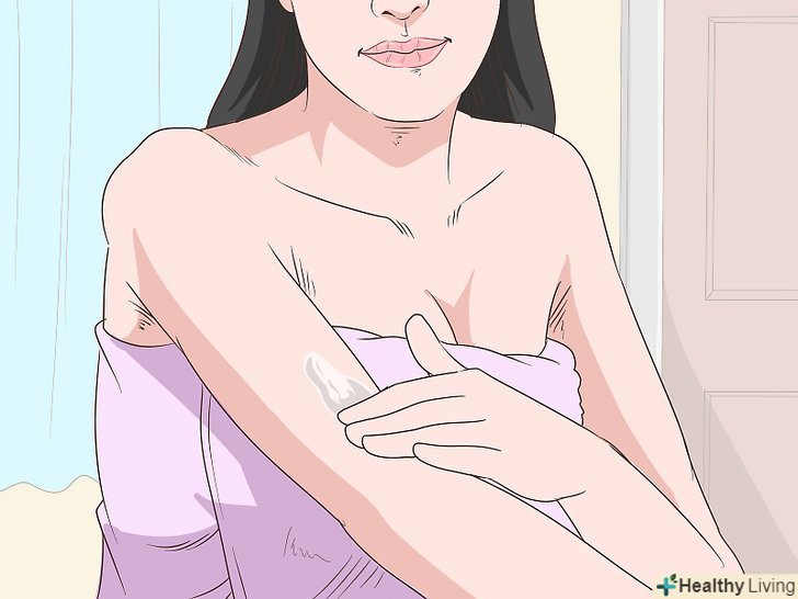 Нанесіть зволожуючий лосьйон. оскільки більшість лосьйонів в якості основи містять масло або ліпіди (жири), вони можуть бути ефективні для видалення липкого шару лейкопластиру — зовсім як дитяче і рослинні масла. Втирайте в шкіру невелику кількість лосьйону, залиште на кілька хвилин, щоб лосьйон подіяв, а після цього акуратно протріть область серветкою або ватним диском.- Найкраще вибирати лосьйони без запаху. Хімічні речовини, які використовуються для ароматизації, можуть викликати хворобливі відчуття і висип на роздратованій шкірі. [6]