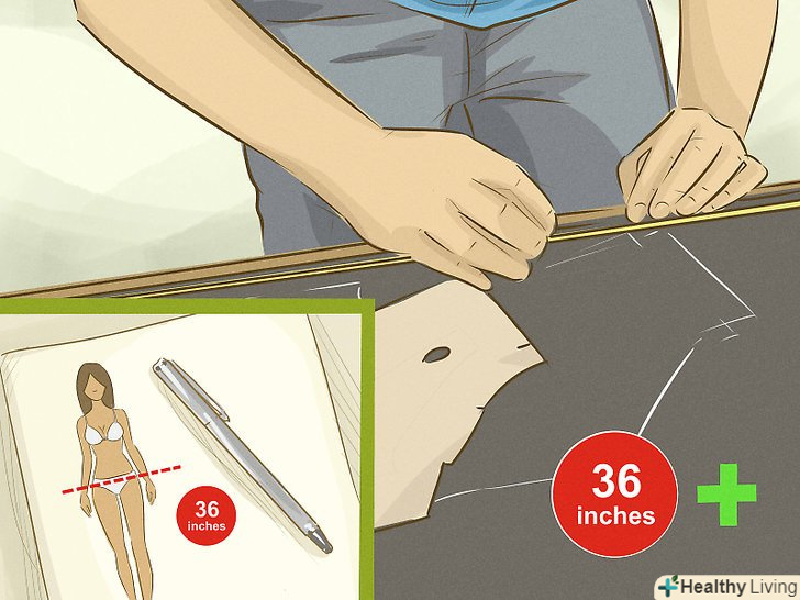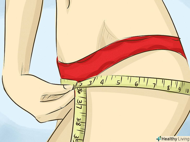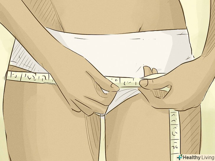Прикладіть початковий кінець сантиметрової стрічки до одного з стегон. Не має значення, з якого стегна ви почнете. Докласти сантиметрову стрічку можна і ближче до центральної осі вашого тіла, якщо вам так зручніше. Головне, міцно тримати в цьому місці початковий кінець сантиметрової стрічки, поки ви будете обертати її навколо тіла. [6]- Сантиметрова стрічка є м'яким і пластичним вимірювальним інструментом, який можна придбати окремо або в складі швейних наборів в будь-якому магазині тканин або товарів для рукоділля. Також іноді сантиметрові стрічки можна знайти у великих гіпермаркетах і навіть в аптеках. У більшості випадків сантиметрові стрічки коштують зовсім недорого. [7]