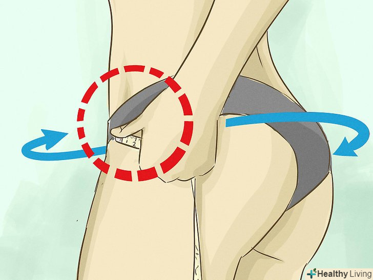Обхопіть стегна навколо сантиметровою стрічкою. проведіть сантиметрову стрічку через сідниці, простеживши за тим, щоб вона не перекрутилася. І, нарешті, приведіть вільний кінець стрічки до початкової точки біля стегна. При цьому стрічка повинна повністю обхопити ваші стегна. [10]- Також ви можете спочатку взяти сантиметрову стрічку за обидва кінці таким чином, щоб вона проходила ззаду по сідницях. Це корисно, коли у вас виникають труднощі з тим, щоб почати з одного кінця стрічки і провести другий по попі і навколо тіла.