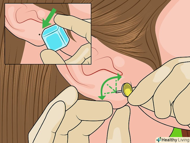 Спробуйте "вкрутити" сережку в прокол. акуратно крутите стрижень сережки, поступово вставляючи його все глибше в прокол. Можливо, доведеться витратити кілька хвилин, щоб знайти відповідний кут і проштовхнути стрижень сережки в прокол. [7] великий палець помістіть на задню поверхню мочки вуха (на область проколу), щоб відчувати розташування стрижня сережки.- Якщо ви відчуваєте дискомфорт або біль, спробуйте викликати оніміння мочки вуха, приклавши до неї лід на кілька хвилин, а потім спробуйте ще раз. [8] якщо ви все ще відчуваєте біль і дискомфорт під час цієї процедури, зверніться за допомогою до фахівця.