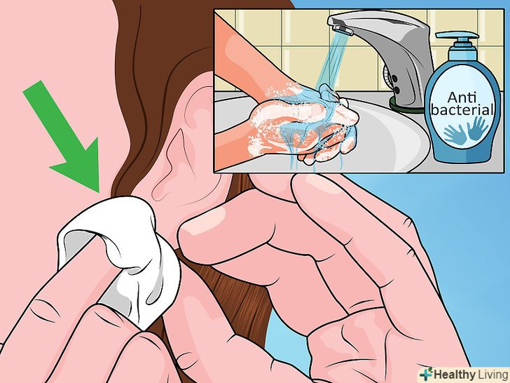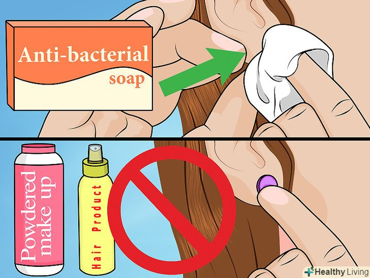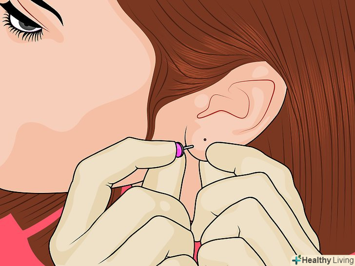 Важливо запобігти інфікуванню мочки вуха після того, як у вас вийшло пройти прокол сережкою. як тільки вставите сережку в прокол, потрібно промити мочку вуха теплою водою і антибактеріальним милом для профілактики роздратування і інфікування. Важливо часто не торкатися руками до мочки вуха, щоб не занести інфекцію, оскільки область проколу починає гоїтися. Намагайтеся кілька днів не користуватися ніякими продуктами для волосся і пудрою, щоб на область проколу нічого не потрапило. [10]