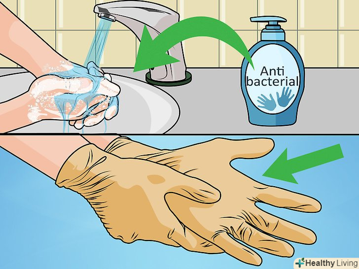 Вимийте руки і надіньте латексні рукавички. ретельно вимийте руки водою і антибактеріальним милом протягом 30 секунд, щоб змити всю бруд, шкірне сало, мікроби. Після того, як ви обполоснули і висушили руки, потрібно надіти пару латексних рукавичок. Це гарантує, що бактерії не потраплять в ранку. [2]