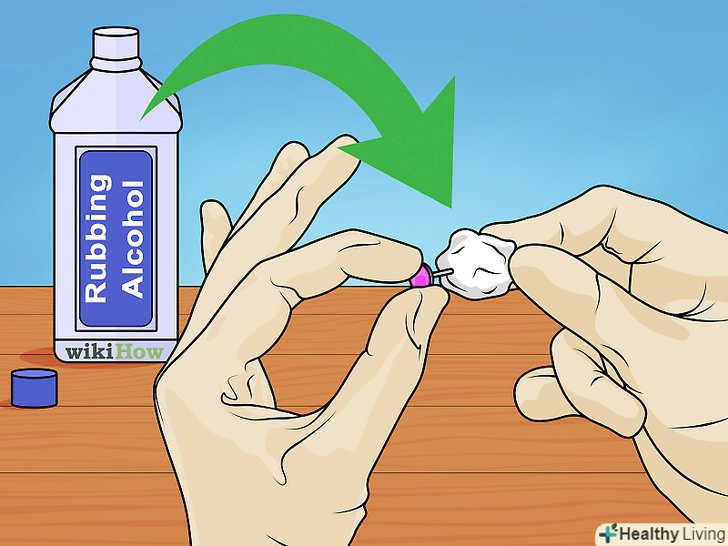 Дезінфікуйте сережки спиртом. підійде ізопропіловий спирт (також відомий, як ізопропанол) або медичний спирт, який можна знайти в аптеці або в продуктовому супермаркеті. Протріть спиртом мочку вуха-алкоголь надає сильний дезінфікуючий ефект, вбиваючи більшість бактерій, грибів і вірусів, які мешкають на поверхні шкіри. Змочіть ватний тампон або ватний диск спиртом і протріть сережки (ту частину, де тонкий стрижень). Саме цією частиною сережки ви» розкриєте " прокол. Потрібно ретельно очистити поверхню. Покладіть сережки на чисту поверхню, щоб вони висохли.- Якщо у вас є алергія, обов'язково купіть срібні або золоті (гіпоалергенні) сережки, щоб не було алергічної реакції. [3]