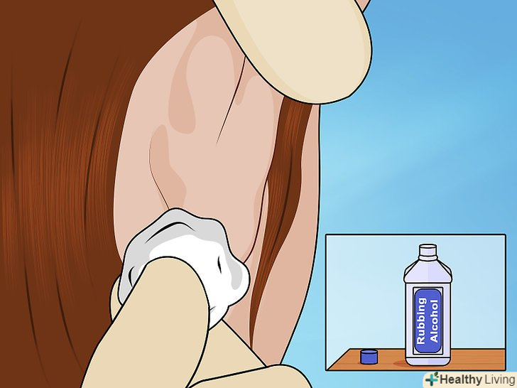 Продезінфікуйте мочку вуха. візьміть новий ватний тампон або ватний диск, просочений спиртом, і продезінфікуйте мочку вуха. Обов'язково протріть передню і задню поверхню мочки вуха, але найбільшу увагу потрібно приділити місцю проколу.