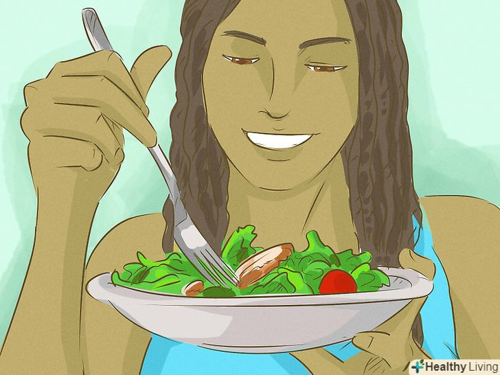 Харчуйтеся правильно і збалансовано. Половина тарілки повинна припадати на овочі, чверть на білок і ще чверть на крохмалисті продукти або злаки. Між основними прийомами їжі можна перекушувати свіжими овочами і фруктами. Також намагайтеся випивати 8-12 склянок води щодня, щоб підтримувати водний баланс організму . [18]- Якщо ви часто переїдаєте під час основних прийомів їжі, спробуйте їсти з маленьких тарілок, тому що так вам буде здаватися, що ви з'їдаєте більше.
