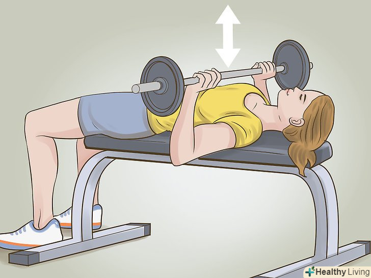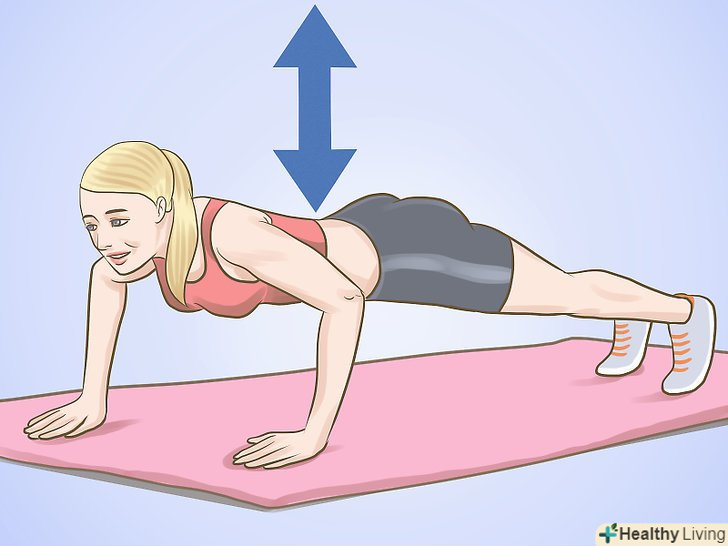 РобітьВіджимання , щоб натренувати грудні м'язи. всупереч поширеному міфу, накачані м'язи грудної клітини не зменшують розмір бюста, а збільшують його. Кожен день робіть віджимання, щоб накачати грудні м'язи. Покладіть долоні на підлогу, руки і ноги на відстані плечей. Зігніть лікті, потім знову розігніть. Повторюйте, поки не втомитеся. [12] почніть з 5-10 віджимань за підхід і з плином часу збільшуйте це число. [13]- Якщо ви не можете віджиматися, стоячи на пальцях ніг і руках, спробуйте спертися на руки і на коліна і віджимайтеся.