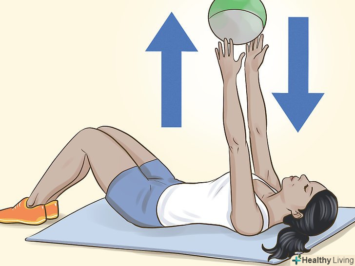 Скористайтеся спеціальним медичним м'ячем (медбол), щоб накачати грудні м'язи. лягайте на підлогу горілиць, зігніть коліна і поставте ноги на підлогу. Тримайте медбол над грудьми. Потім підкиньте м'яч вгору, потім зловіть його, закиньте руки з м'ячем назад, потім повторіть вправу. [15]