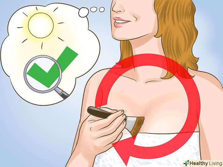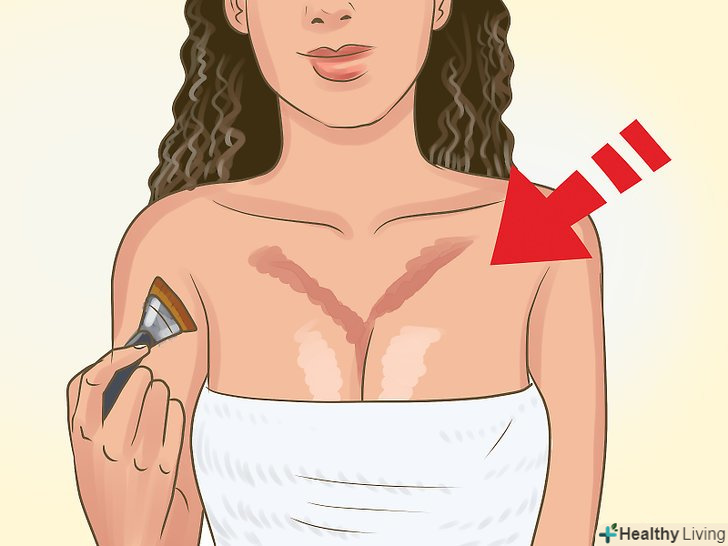 Візьміть матовий бронзер. за допомогою контурування можна створити кілька тіней на грудях, які візуально збільшать бюст. Візьміть бронзер на один або два відтінки темніше , ніж тон вашої шкіри. Таким чином, контурування буде виглядати більш природно, і ви зможете надати бюсту будь-яку форму. [19]- Перш ніж наносити бронзер на обличчя, його потрібно протестувати на руці, щоб переконатися в тому, що ви правильно підібрали колір.