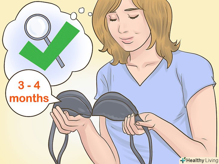 Перевіряйте бюстгальтер на зношеність кожні 3-4 місяці. старі зношені бюстгальтери не підтримують груди в повній мірі. Крім того, матеріал бюстгальтера з часом зношується і псується. Одягніть бюстгальтер і подивіться на себе в дзеркало. Якщо соски на грудях не підняті, а спрямовані вниз — прийшов час купити новий бюстгальтер. [6]