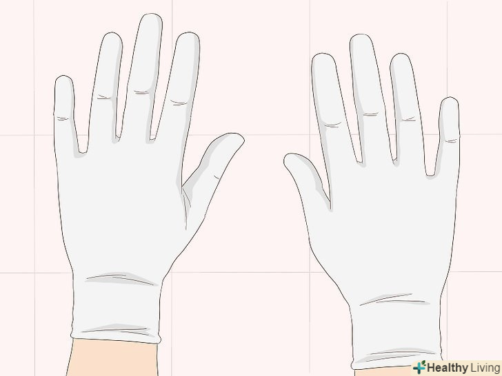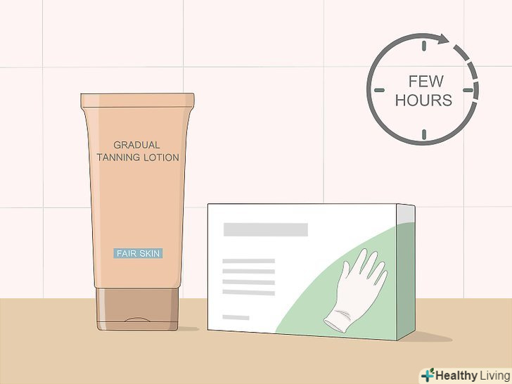 Використовуйте рукавички. рукавички захистять ваші долоні від фарбування і вбирання лосьйону, призначеного для тіла. Краще використовувати пару дешевих латексних рукавичок під час нанесення лосьйону для автозасмаги. [4]- Якщо у вас алергія на латекс, пошукайте в інтернеті або магазині косметики альтернативу, але з матеріалу без волокон.