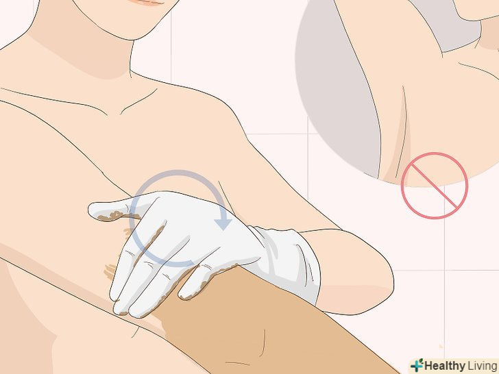 Пройдіться по цятках і світлим ділянкам. Якщо ви помітили, що пропустили кілька ділянок шкіри, надіньте чисті рукавички і нанесіть трохи лосьйону на долоню. Наносите лосьйон так само, як і раніше. Обов'язково покрийте шкіру невеликою кількістю лосьйону вдруге і постарайтеся розтушувати його по краях, щоб домогтися рівномірного покриття. [9]- Витріть надлишки лосьйону вологою тканиною.