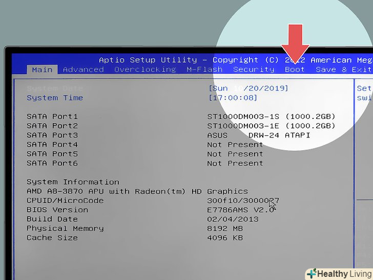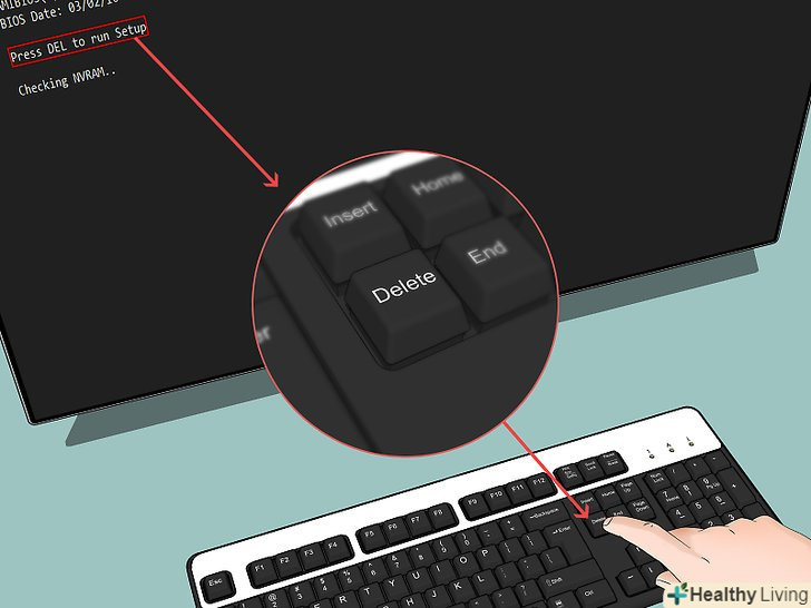 5. Увійдіть в BIOS.як тільки ви клацнете по "перезавантажити", почніть натискати клавішу для входу в BIOS. Зазвичай такою клавішею є Del або одна з F-клавіш (наприклад, F2). Якщо ви не знаєте, яку клавішу натиснути, почитайте інструкцію до комп'ютера або материнської плати (таку інструкцію можна знайти в Інтернеті).
