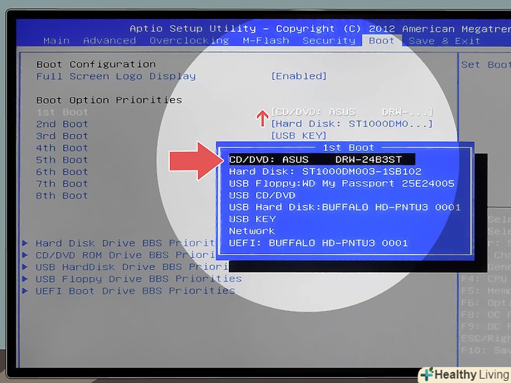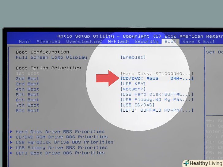 7. Виберіть DVD-привід комп'ютера. він повинен називатися «CD Drive» (Дисковод) або «Disk Drive "(оптичний привід), або якось аналогічно. Використовуйте клавіші зі стрілками, щоб вибрати відповідну опцію.