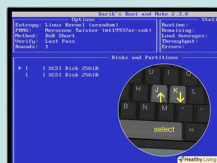 10. Виберіть жорсткий диск комп'ютера. Коли програма DBAN запуститься, натисніть клавішу J або K, щоб маркером виділити жорсткий диск, а потім натисніть Пробіл.
