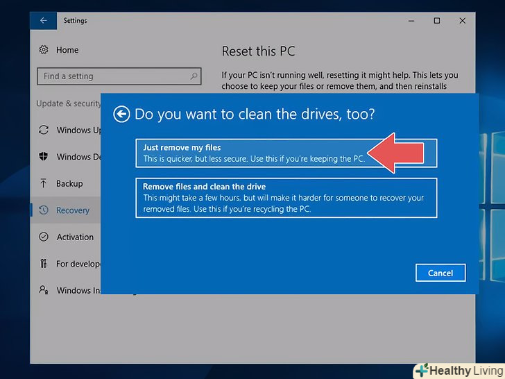 • Якщо ви хочете виконати повне скидання системи, виберіть опцію " Видалити мої файли і очистити диск». Пам'ятайте, що цей процес може зайняти кілька годин і вам доведеться заново встановити Windows.