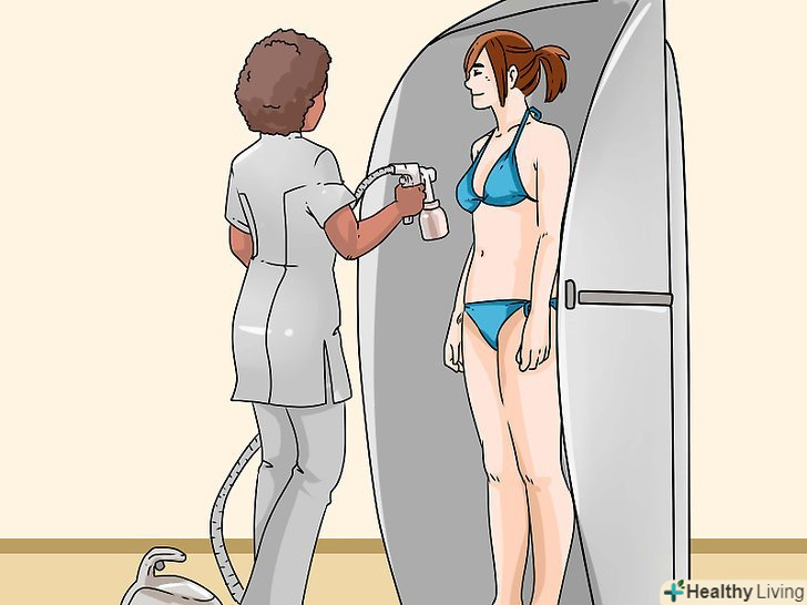 Нанесіть автозагар у кваліфікованого фахівця. фахівці з розпилення автозасмаги використовують пульверизатор, щоб акуратно наносити засіб, який зіллється з відтінком вашої шкіри. Це також дає вам можливість покрити засмагою певні ділянки тіла в комфортній обстановці косметичного кабінету. Подібний вид автозасмаги зберігається близько двох тижнів і сходить з тією ж швидкістю, що і природний загар. [7]- Вартість процедури нанесення автозасмаги може бути досить високою. Дізнайтеся ціну у адміністратора, перш ніж записуватися на процедуру.
