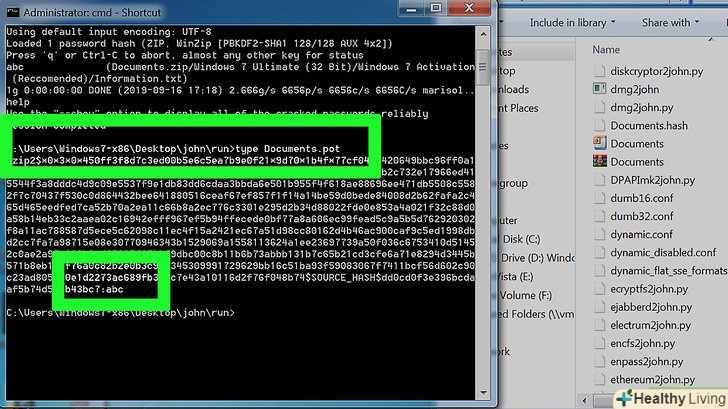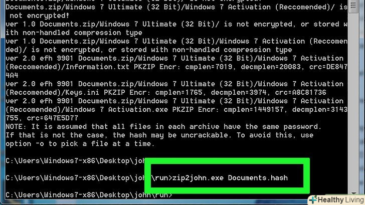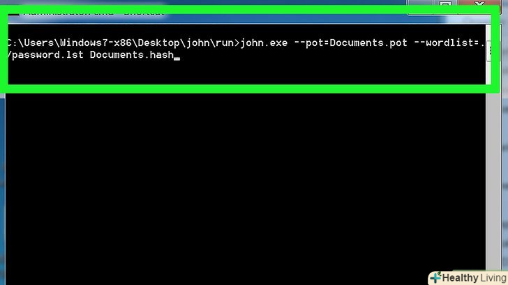 Запустіть процес злому пароля. введіть john.exe --pot=ім'я.pot --wordlist=john/run/password.lst ім'я.hash і натисніть ↵ Enter. John the Ripper почне підбирати пароль до Вашого ZIP-файлу по своїй базі даних паролів.[2]- Замість» ім'я " підставте ім'я свого ZIP-файлу.