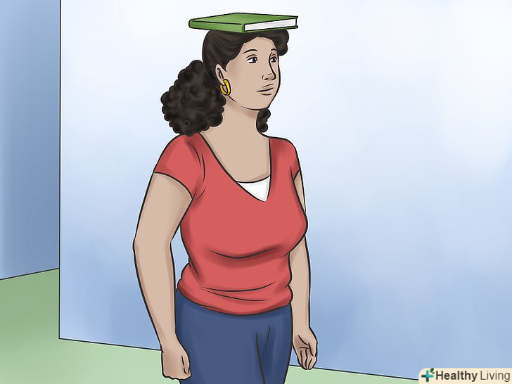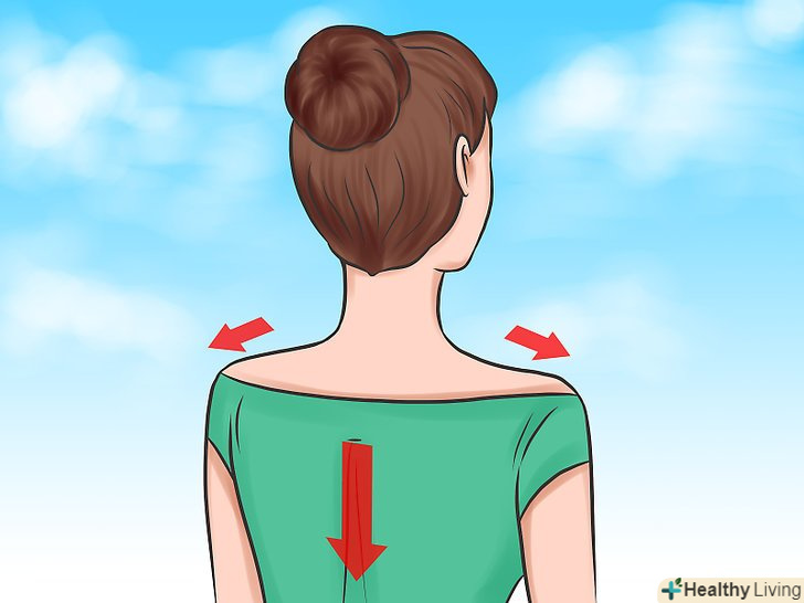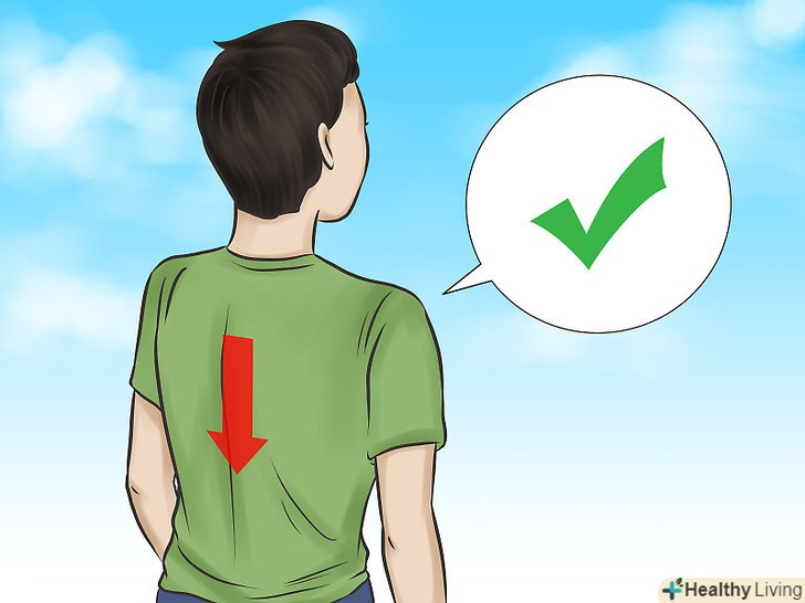 Не забувайте про плечі. намагайтеся опускати плечі вниз і відсувати їх назад. Чи не сутультесь і не піднімайте плечі до вух, ні при ходьбі, ні в стані спокою. [2]- Якщо ви не впевнені в тому, що ваші плечі займають правильне положення, притуліться спиною до стіни. Вам доведеться відвести плечі назад, щоб вони дотягнулися до стіни, але не так сильно, щоб вони завадили вам доторкнутися до стіни шийними хребцями.