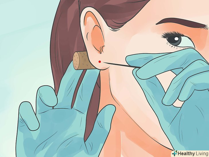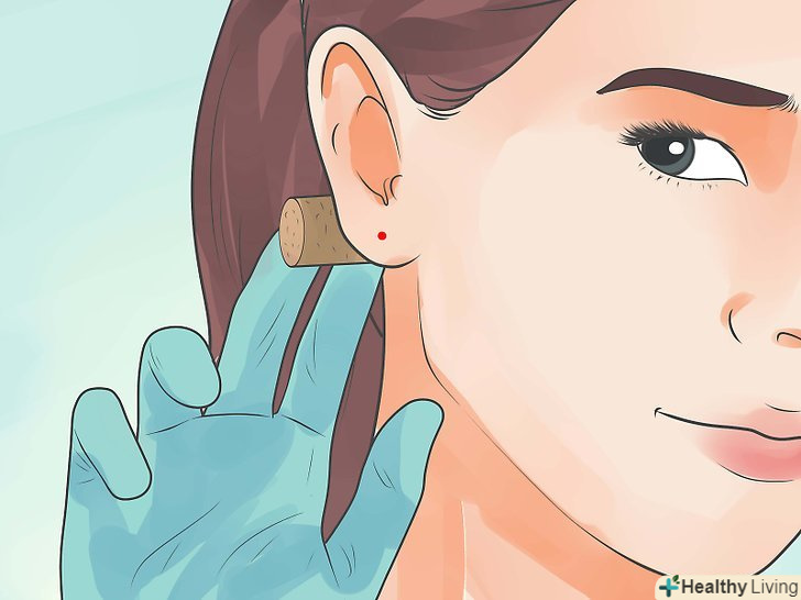 Знайдіть який-небудь міцний предмет, щоб прикласти його до вуха. він знадобиться, щоб після проколу вуха ви випадково не вкололи себе в шию. Підійде шматок мила або пробка з-під вина. Не прикладайте яблуко або картоплю. Яблука, картопля або будь-які інші фрукти або овочі містять бактерії, які можуть викликати запалення в місці проколу. [6]- Якщо можливо, то попросіть друга (або друзів) допомогти вам з пірсингом. Нехай він або притискає пробку до вашого вуха або, якщо ви йому довіряєте, проколе вам вухо. Весь цей процес пройде набагато легше, якщо поруч з вами буде хтось, хто зможе допомогти.