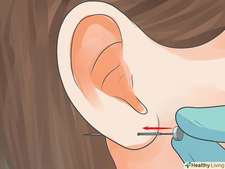 Правильно направте голку до вуха. голка повинна бути спрямована перпендикулярно до мочки, тобто під кутом в 90 градусів до позначки, яку ви зробили на вусі. Це дозволить вам більш ефективно зробити прокол.