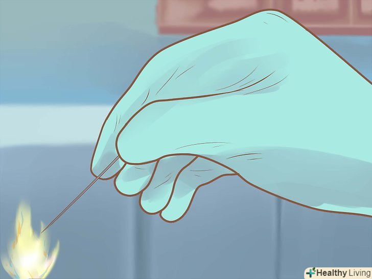 Простерилизуйте голку на вогні. не використовуйте чужі голки, використовуйте нову з стерильної упаковки. Тримайте голку над полум'ям, поки її наконечник не стане червоним. Обов'язково одягніть стерильні латексні рукавички, щоб на голку не потрапили бактерії з ваших рук. Зітріть з голки сажу і нагар. Протріть голку розчином 10% медичного спирту або перекисом водню. Знайте-це міра частковою стерилізацією, і на голці можуть залишитися мікроби. Єдиний спосіб повністю стерилізувати голку-це використовувати автоклав. [3]- Ви можете простерилізувати голку в окропі. Як тільки вода закипить, опустіть в неї голку і залиште на 5-10 хвилин. Витягніть її щипцями і тримайте тільки в стерильних рукавичках. Протріть голку перекисом водню або медичним спиртом. [4]