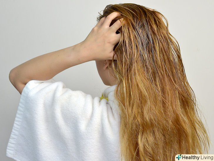 Втирайте кокосове масло в волосся. нехай воно охолоне протягом декількох миттєвостей, щоб воно не було палюче гарячим, потім вилийте кокосове масло на голову, рівномірно розподіляючи на шкірі голови. Використовуйте пальці для масування і рівномірного розподілу по волоссю від коренів до кінчиків. Продовжуйте втирати масло в волосся, поки ваше волосся повністю не покриються кокосовим маслом.- Можна використовувати гребінець для рівномірного розподілу масла по волоссю. Розчісуйте волосся від коренів до кінчиків.