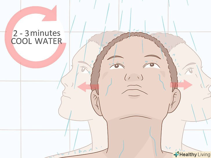 Промийте очі прохолодною водою. [3] Припустимо, ви в душі. Тоді зробіть воду трохи холодніше, щоб вона була прохолодною. Відкрийте очі і підставте обличчя прямо під душ, щоб вода максимально потрапляла на обличчя і очі. Злегка поверніть голову з боку в бік (кілька разів), щоб вода потрапила на обидва ока. Постарайтеся якомога ширше відкрити очі, підставивши їх під воду. Таким чином потрібно промивати очі 2-3 хвилини. [4]- Вода повинна виходити з душу під невеликим напором. Якщо ви не можете налаштувати натиск, підставте під душ руки, склавши їх човником, і двома руками наберіть трохи прохолодної води. Потім протягом декількох хвилин промивайте цією водою очі.