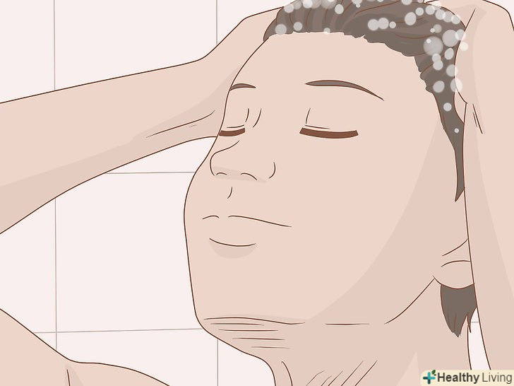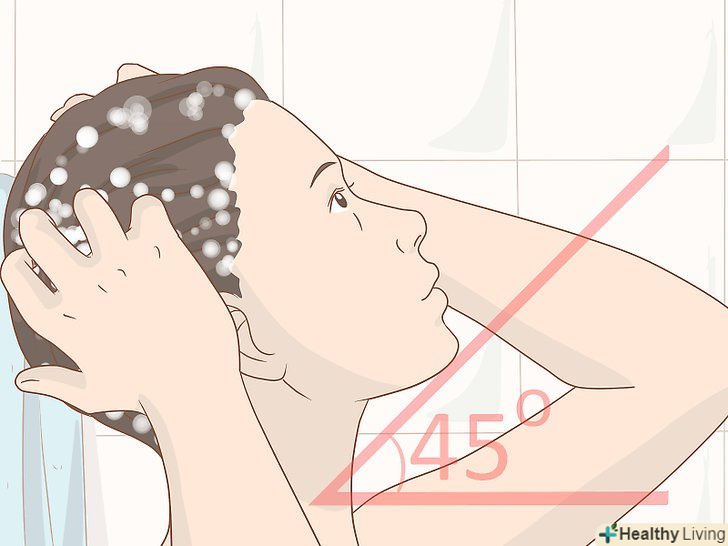 Коли будете мити голову, закиньте її назад. втираючи в волосся шампунь, трохи нахиліть голову назад. Це означає, що вам потрібно як би поглянути на стелю, при цьому положенні голова буде нахилена на 45 градусів по відношенню до стелі. Це положення гарантує, що вся піна і бульбашки від шампуню будуть скочуватися назад, а не на обличчя. Не нахиляйте голову вперед і не тримайте її прямо, як якщо б просто дивилися вперед. Змиваючи шампунь з волосся, не забудьте також нахилити голову назад. [8]