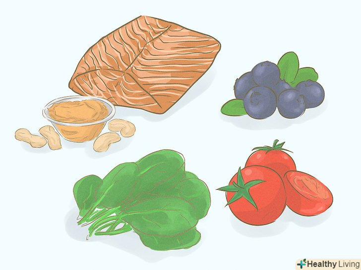 Їжте нежирні та поживні продукти, щоб завжди виглядати і відчувати себе добре. коли організм не отримує потрібних йому поживних речовин, шкіра стає тьмяною і блідою, а під очима з'являються темні кола. Щоб отримувати всі потрібні речовини з продуктів, не їжте їжу з переробленими цукрами, додайте в раціон велику кількість фруктів і овочів, їжте цільнозернові крупи і нежирний білок (курку, індичку, рибу, тофу, сочевицю). [15]- Щоб шкіра була здоровою і сяючою, вибирайте продукти з великим вмістом антиоксидантів: морква, шпинат, помідори, ягоди, горох, квасоля, червону рибу, горіхи.