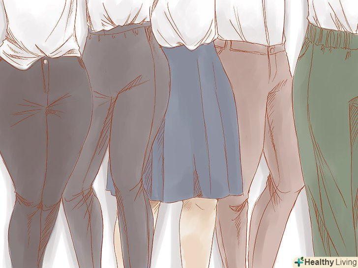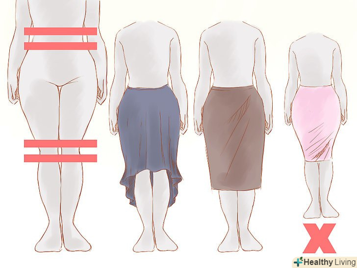 Виберіть кілька спідниць по фігурі. найкраще вибирати спідниці довжиною до коліна або щиколоток. Вони привертають погляд до краю, в той час як короткі спідниці змушують оточуючих дивитися на найширшу частину вашого тіла. Вибирайте спідниці, які тримаються на талії трохи вище ваших стегон з довжиною до коліна. Уникайте вузьких спідниць і вибирайте спідниці з рюшами або намистинами у нижнього краю, щоб привертати увагу до ваших округлим стегнах, при цьому не роблячи їх візуально крупніше. Якщо ці деталі будуть знаходитися на рівні коліна або стегна, Ви зможете ще краще збалансувати ваші стегна.