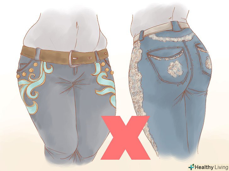 Уникайте обробки на стегнах і попі. хоча джинси з милими прикрашеними намистинами або вишивкою кишенями можуть здатися непоганою ідеєю, вони можуть привернути погляди до вашої найменш виграшної області. Уникайте блискучих штанів і ременів, забудьте про штани з гудзиками, камінням, паєтками або сміливою вишивкою в районі брюк і попи.