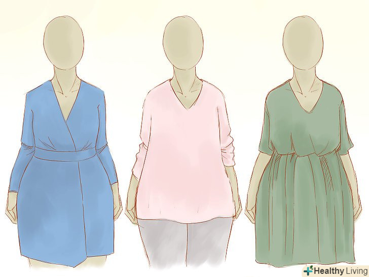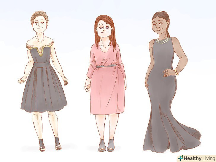 Приміряйте кілька суконь, щоб визначитися з розміром. сукні – відмінний спосіб виконати відразу два завдання: залучити погляди до верхньої частини тулуба, створюючи видимість тонкої талії і при цьому прикриваючи нижню частину тулуба. Вибирайте сукні А-образного силуету або зі спідницею-тюльпаном, уникайте вузьких суконь, які обтягують ваші стегна. Додатковим бонусом буде пояс в районі талії і прикриті плечі, так як це створить ілюзію обсягу в потрібних місцях. [2]