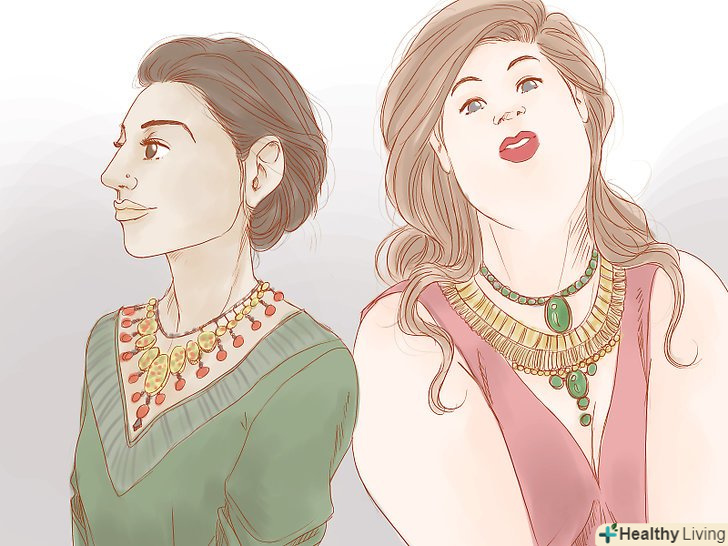 Вибирайте кілька базових намист. сміливе, яскраве намисто, яке низько звисає, привертає увагу до вашої верхньої половини. Додаткові деталі на бюсті створять ілюзію більш повної грудей, а це допоможе краще вибудувати образ. Ви можете вибрати намисто-комірець, яке зробить вашу шию і плечі більш широкими, підкреслюючи також і верхню частину вашого тіла.
