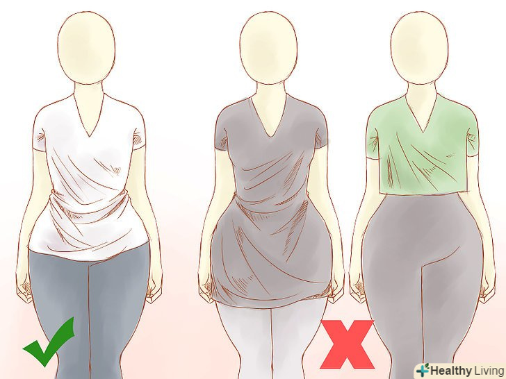 Вибирайте сорочки правильної довжини. вибирайте топи довжиною до середини стегон; топи довжиною до тазової кісточки витягують тулуб і маскують найширшу частину стегон. Намагайтеся не вибирати довші топи, так як вони зроблять найширшу частину ваших ніг ще ширше. З іншого боку, не варто використовувати укорочені топи для залучення уваги до середньої частини тіла, так як вона знаходиться занадто близько до стегон.