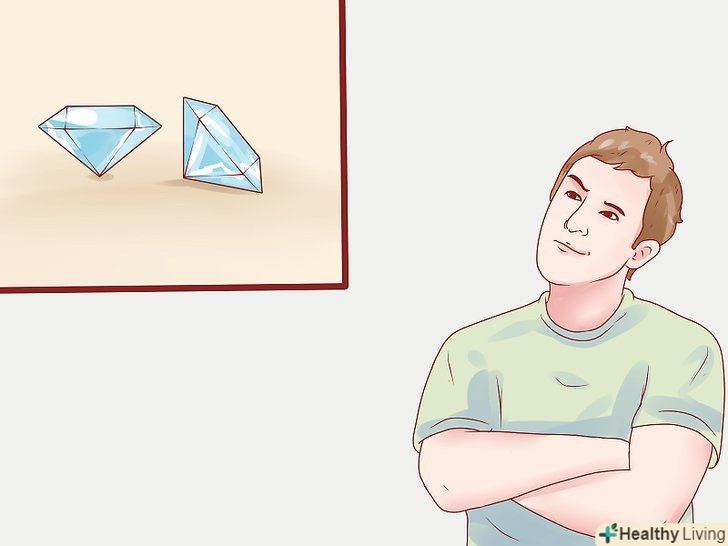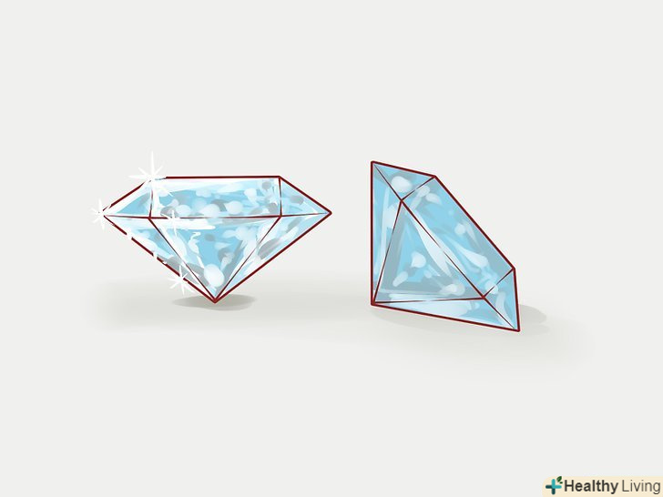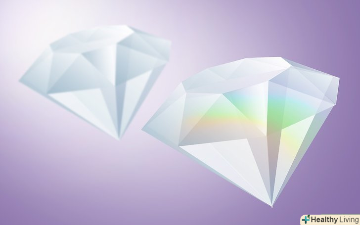 Поспостерігайте за відображеннями. відбиття справжнього діаманта зазвичай проявляються в різних відтінках сірого. Якщо ви бачите райдужні відблиски, то, швидше за все, це неякісний алмаз або підробка. [4]- Замість цього проведіть перевірку на «Сяйво».Справжній діамант значно яскравіше сяє в порівнянні з аналогічним кришталем або кварцом. Вам навіть може захотітися відкласти в сторону кришталь або кварц.