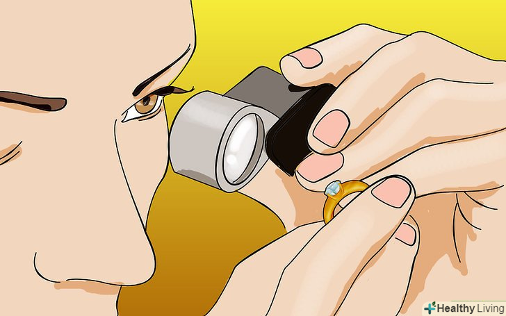 Використовуйте ювелірну лупу, щоб розглянути діамант. зазвичай її можна взяти на час в ювелірному магазині. Видобуваються Діаманти, як правило, мають невеликі природні дефекти, які називаються «вкраплення», які можна побачити за допомогою лупи. Шукайте невеликі вкраплення корисних копалин, або дуже невеликі зміни кольору. Все це ознаки того, що Ви маєте справу з справжнім діамантом, хоча і не досконалим.- Фіаніт і штучно створені діаманти (які повинні пройти всі інші тести) зазвичай не мають дефектів. Це тому, що вони вирощені в стерильному середовищі, замість в «лабораторії землі», де багато випадковостей. Дорогоцінний камінь, який виглядає занадто ідеально, швидше за все підробка.
